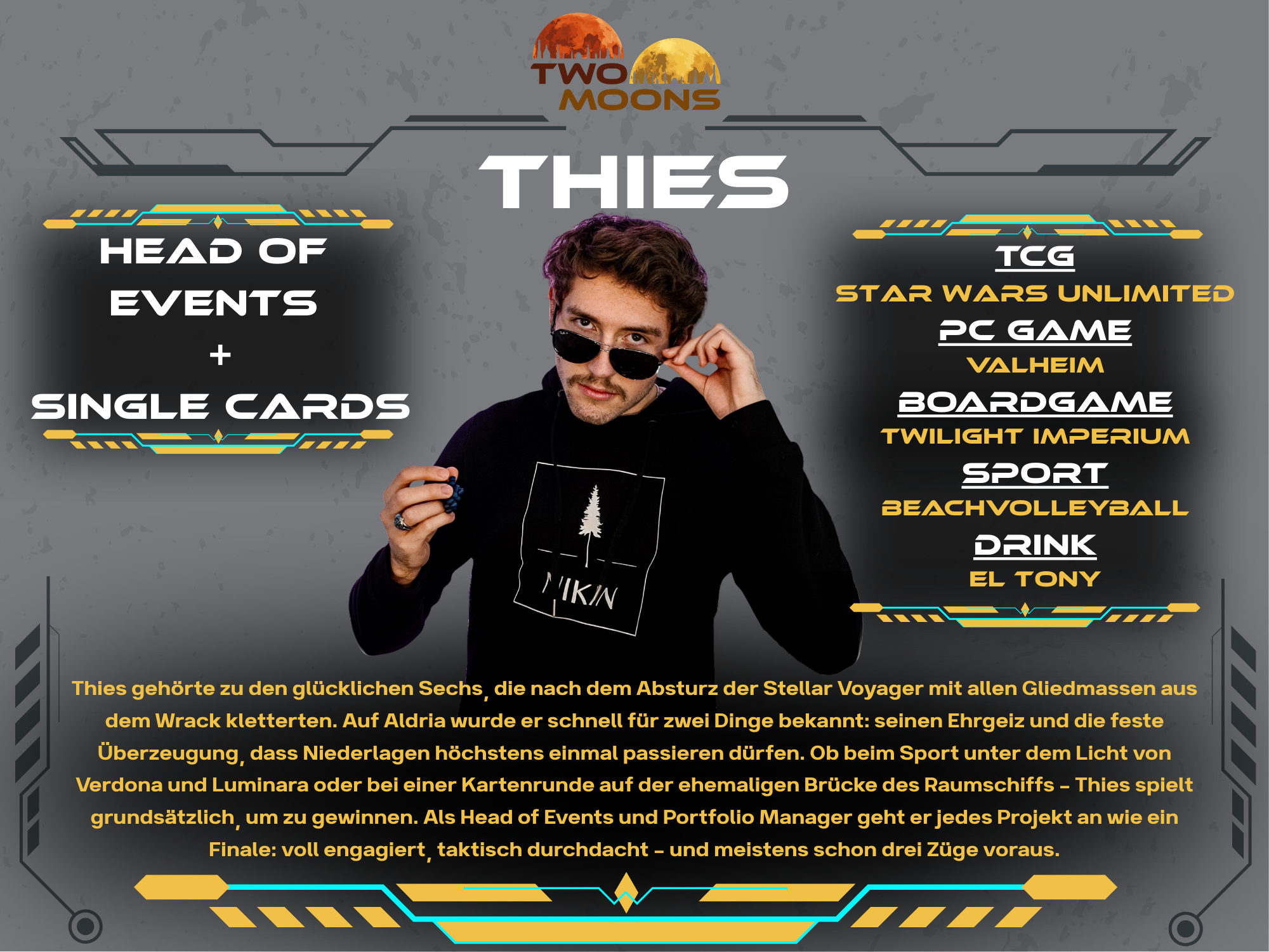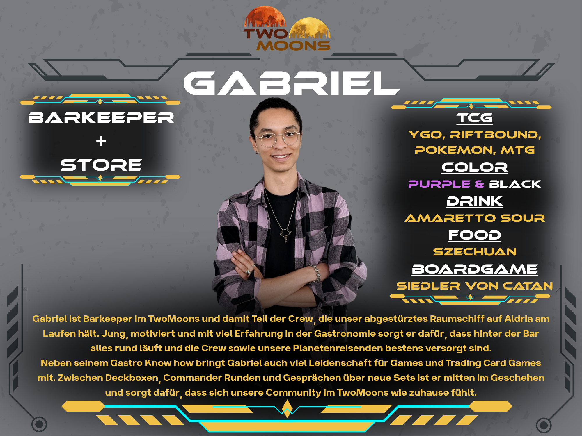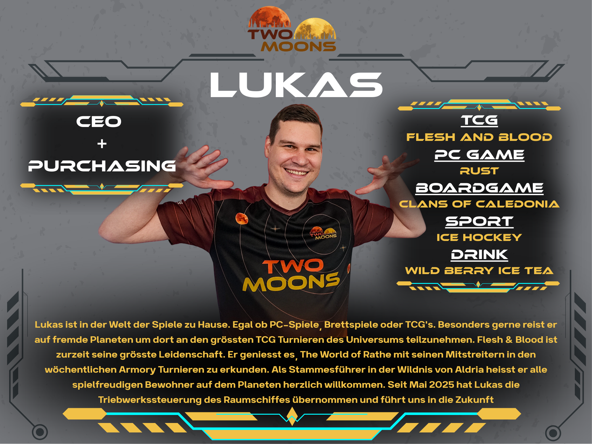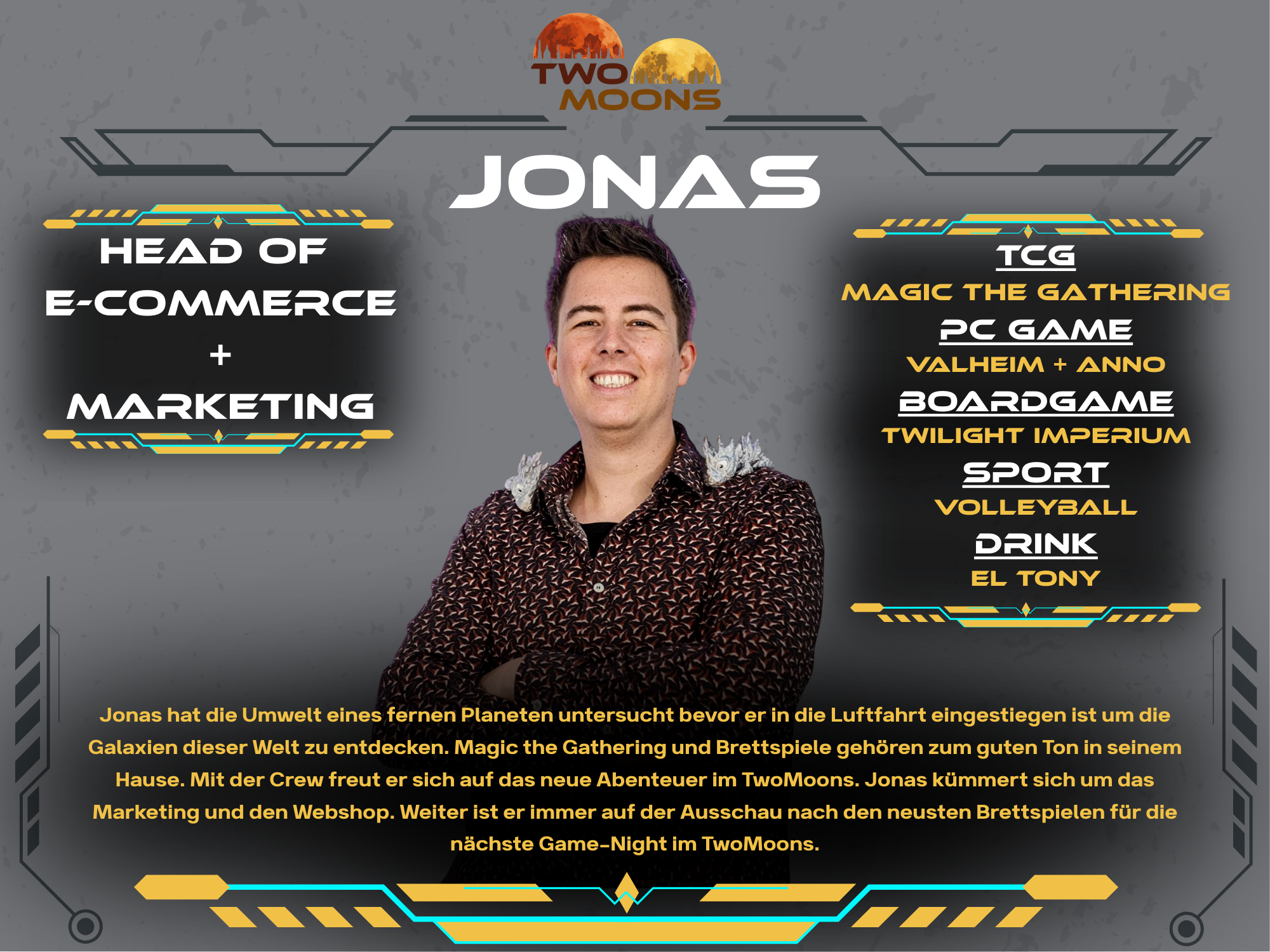 Andy has professionally explored numerous galaxies and is embarking on new adventures with TwoMoons. He supports and organizes the crew to bring the spaceship up to full power. With the rudder in one hand, his Magic The Gathering deck in the other, and a very capable crew around him, he navigates the spaceship through the galaxy. Always with the goal of establishing TwoMoons in the TCG universe.