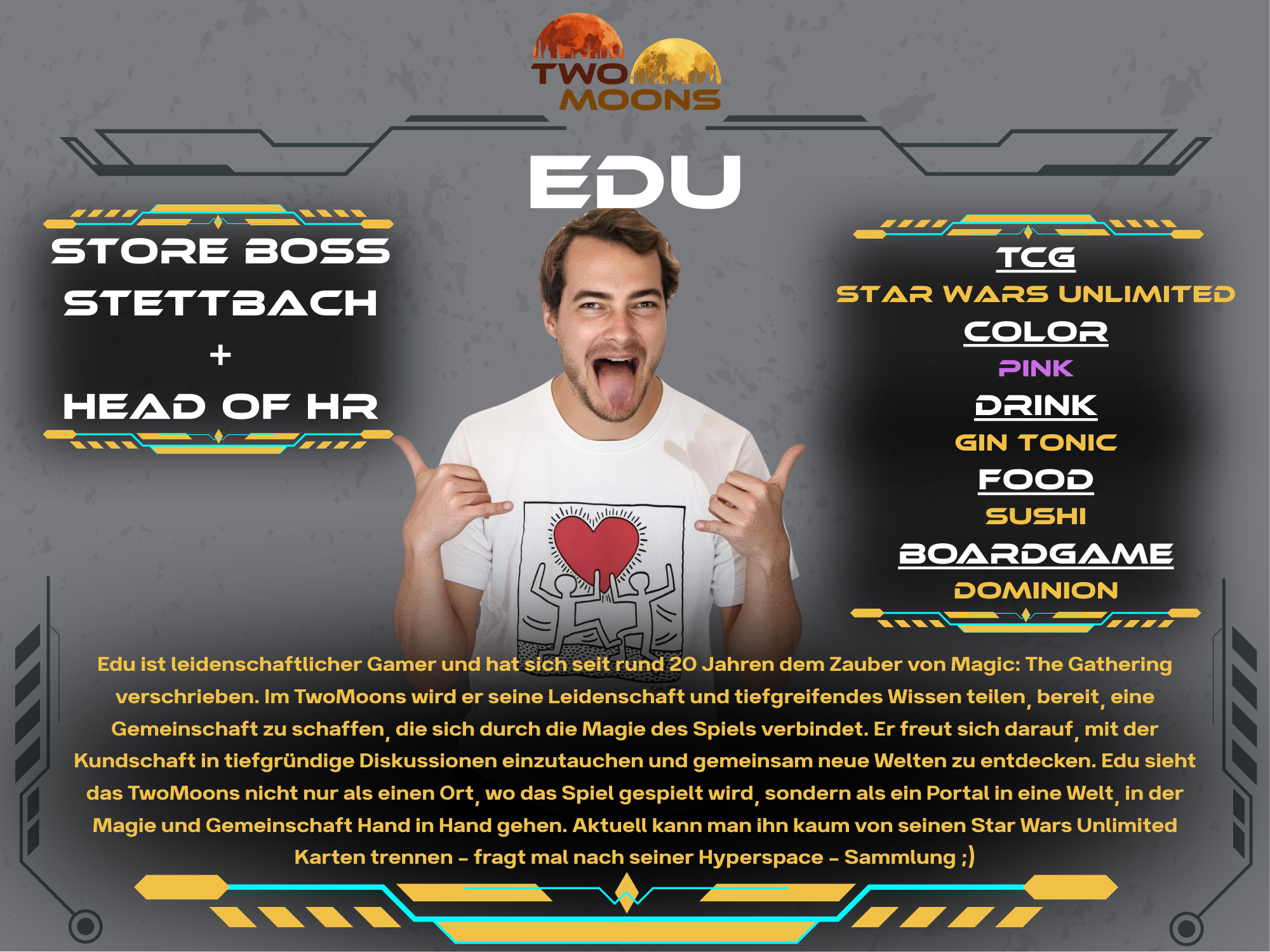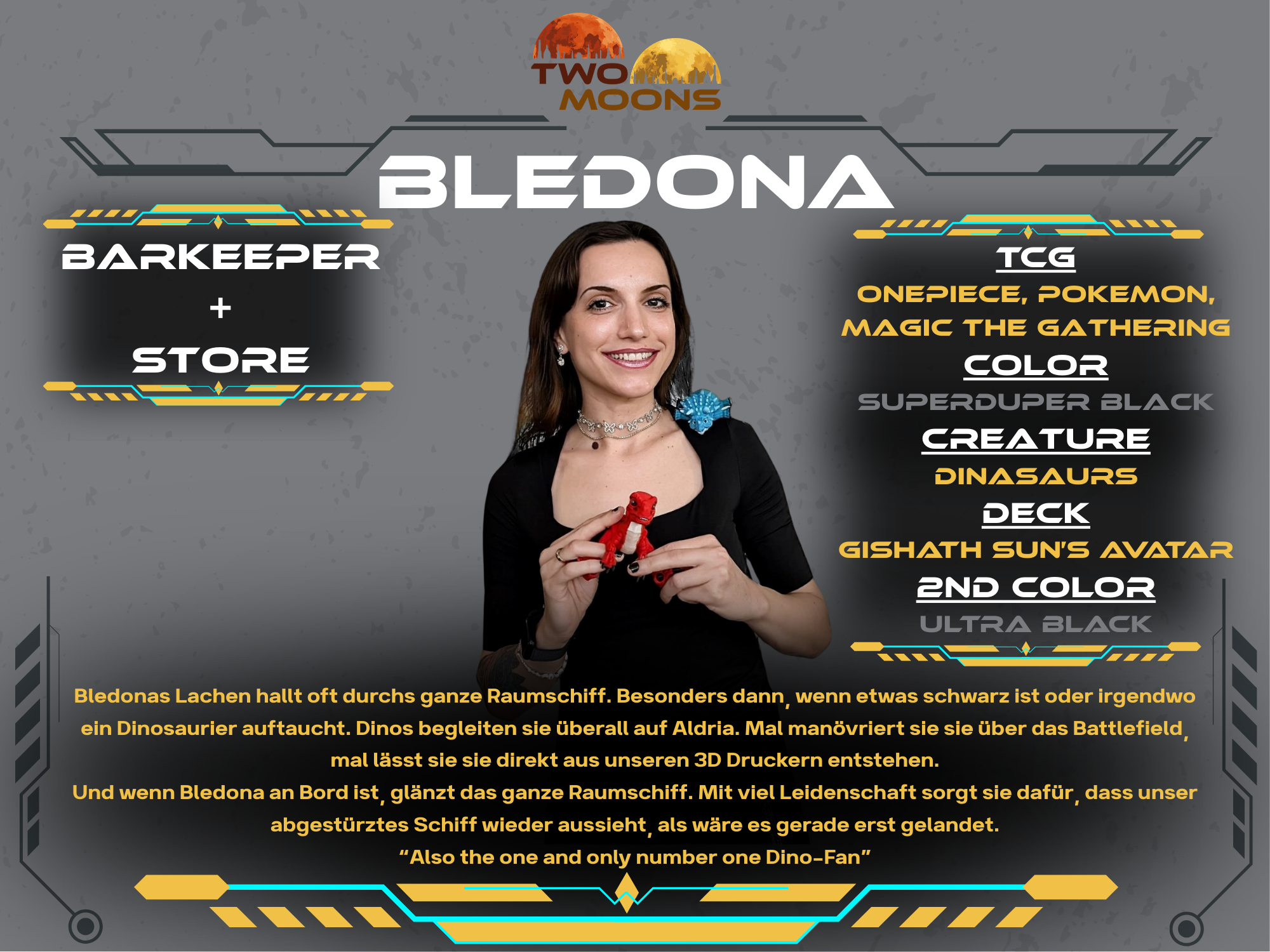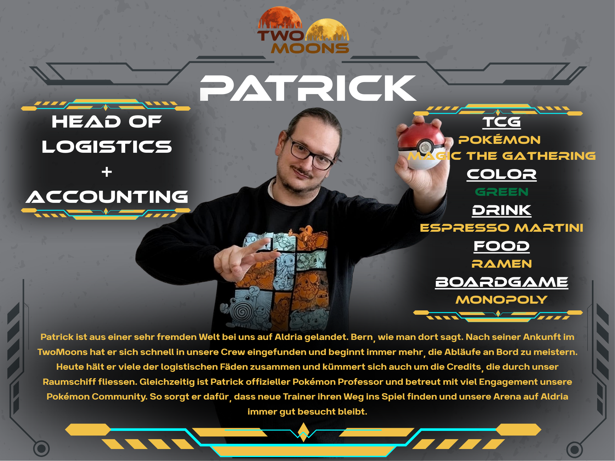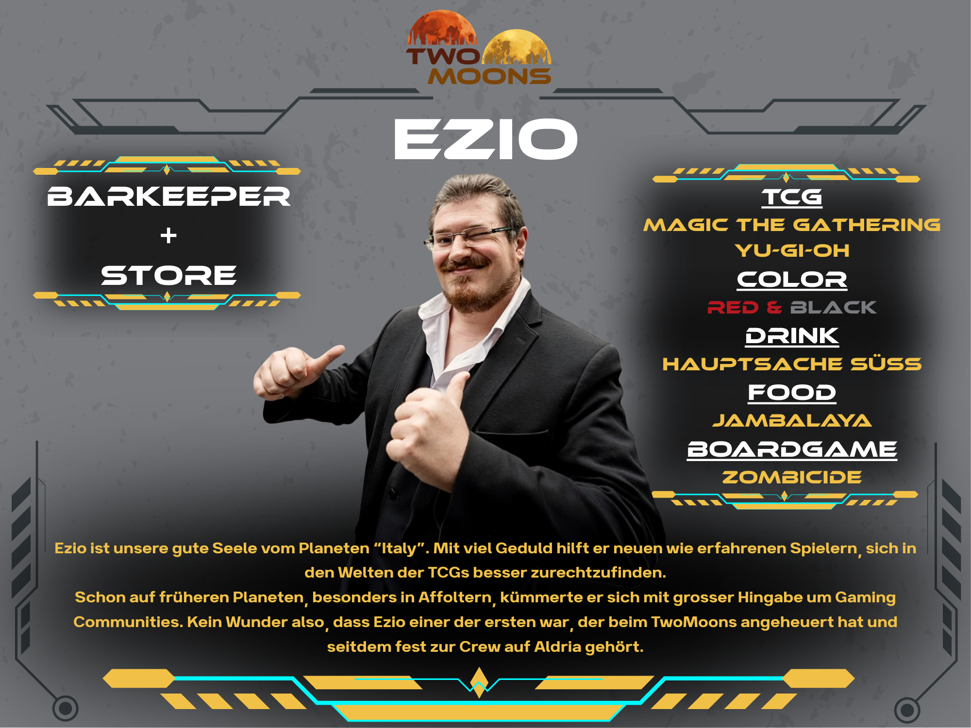Andy has professionally explored numerous galaxies and is embarking on new adventures with TwoMoons. He supports and organizes the crew to bring the spaceship up to full power. With the rudder in one hand, his Magic The Gathering deck in the other, and a very capable crew around him, he navigates the spaceship through the galaxy. Always with the goal of establishing TwoMoons in the TCG universe.